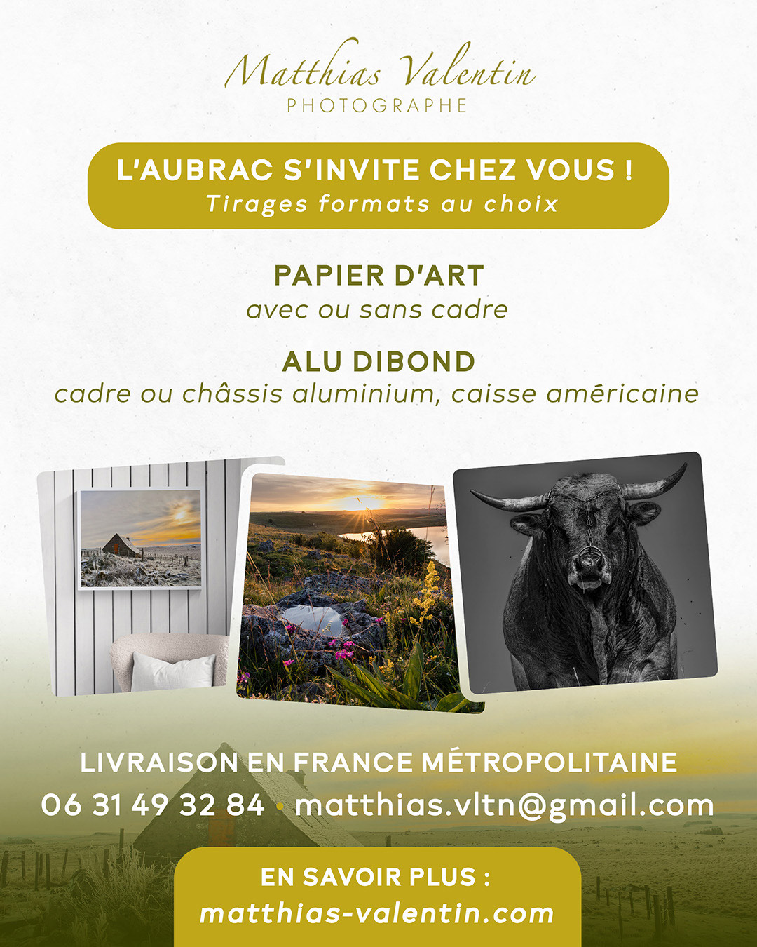 L’ Aubrac s’invite chez vous ! Les lumières, le silence et les grands espaces du plateau apportent force et caractère à votre intérieur. Particulier ou professionnel, chaque photo évoque une ambiance, un souvenir, et trouve naturellement sa place dans votre espace. Tirages sur papier d’art ou Alu Dibond, disponibles en plusieurs formats ou réalisés sur mesure pour emporter avec vous l’image de l’Aubrac qui vous correspond. (Livraison en France métropolitaine)